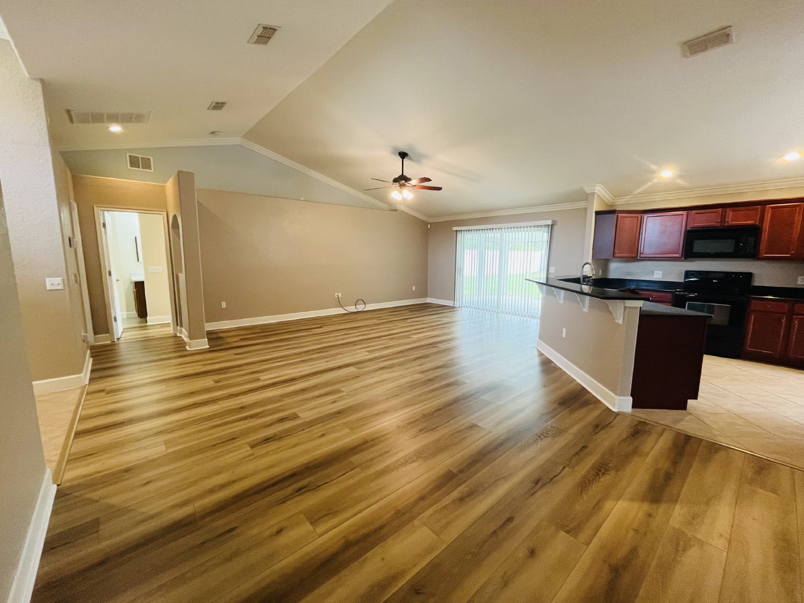 Beautifully updated 4 bedroom 2 bathroom single family home in the Falcons Landing community. This home is newly updated with granite countertops, laminate flooring, with new fixtures and vanities in the bathrooms. With an open floor plan and sliding patio doors that leads to a large screened in patio and completely fenced in backyard this home is perfect for entertaining.